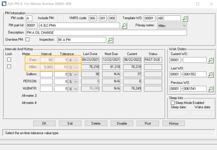 Previously, in order to be considered “On Time”, that job would have to be completed at the exact odometer reading or on the exact date of the due PM service, according to the schedule in the Vehicle Master File (MVM). While this IS an indication of true compliance, and can still be a standard worth pursuing, we’ve decided to make it more simple to be compliant through a Tolerance option available for each PM.