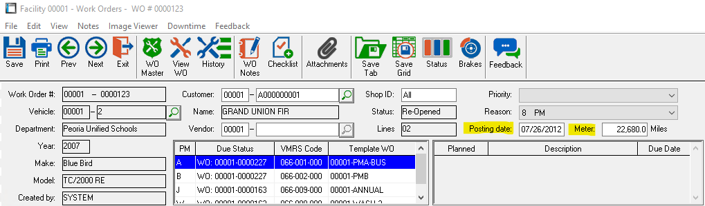 By default, this meter will match the work order meter according to the highest posting date. Whatever the meter was on that posting date is what will show when the work order is viewed in the future. This meter CAN be updated at anytime before a posting, which will create a new transaction record.